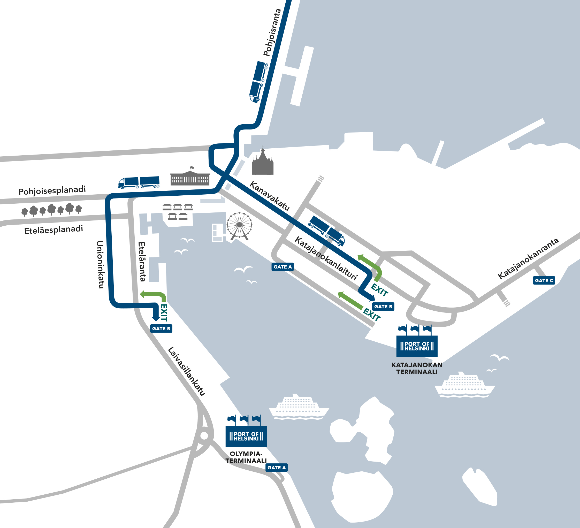 All heavy traffic destined for the Olympia Terminal (Silja Line) must travel through the Gate B.