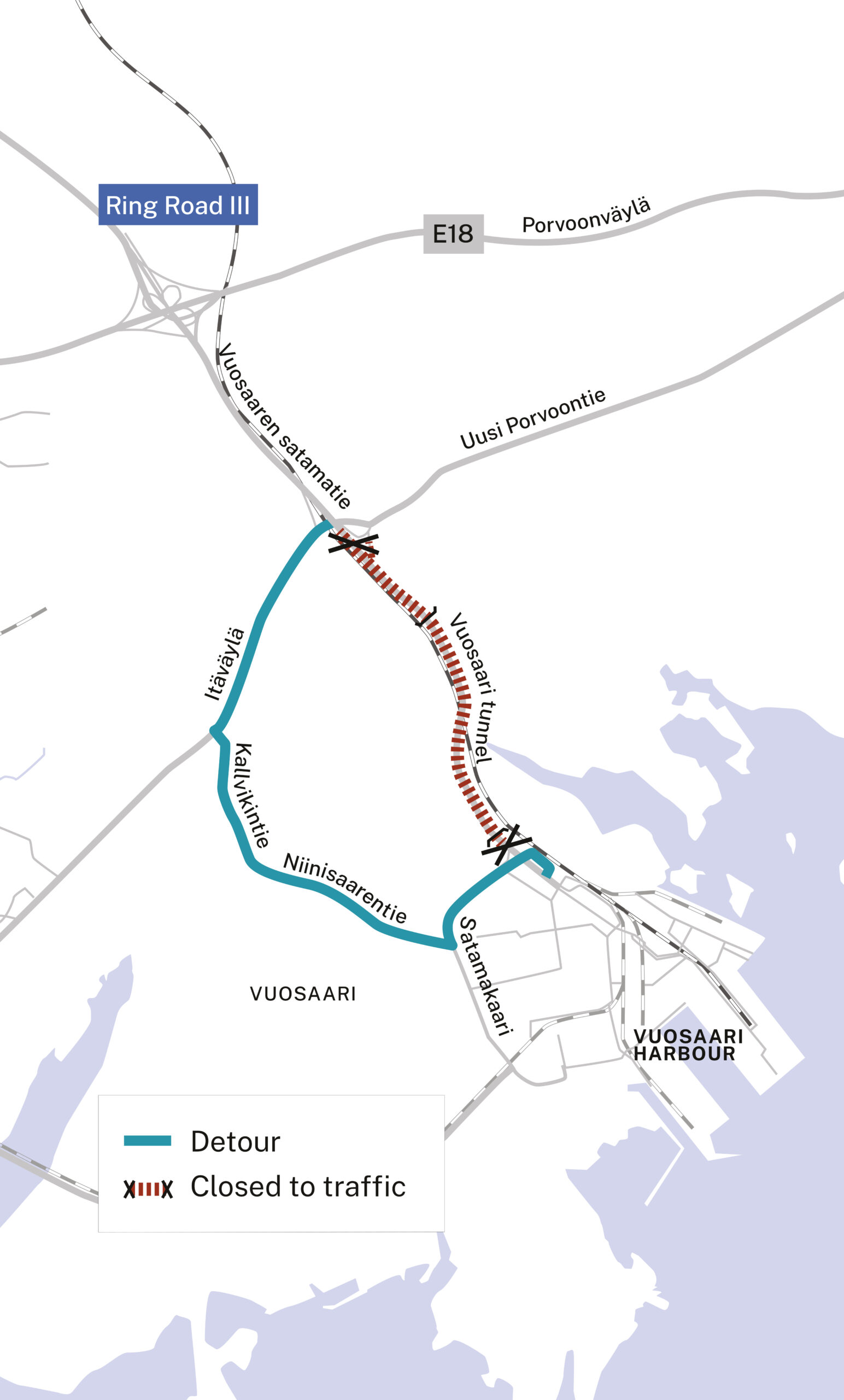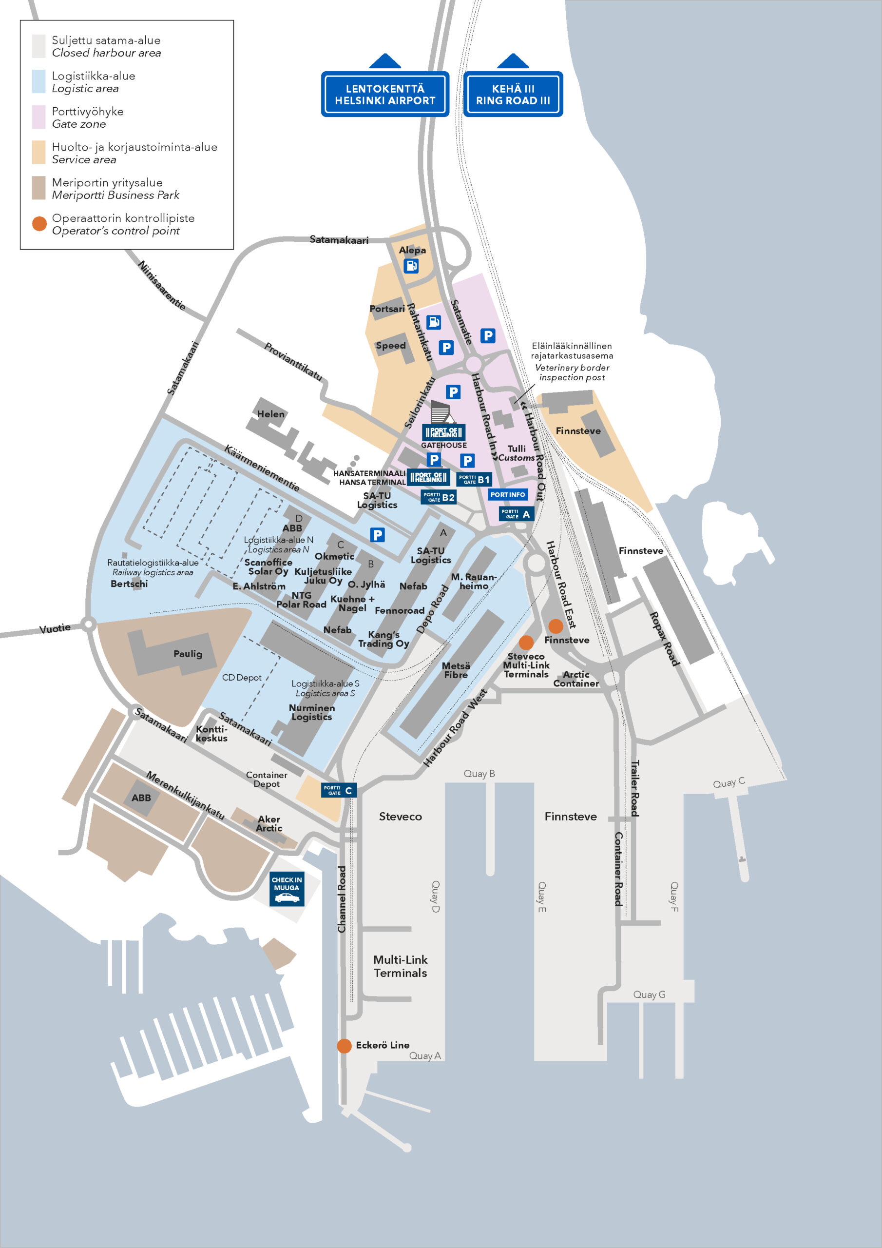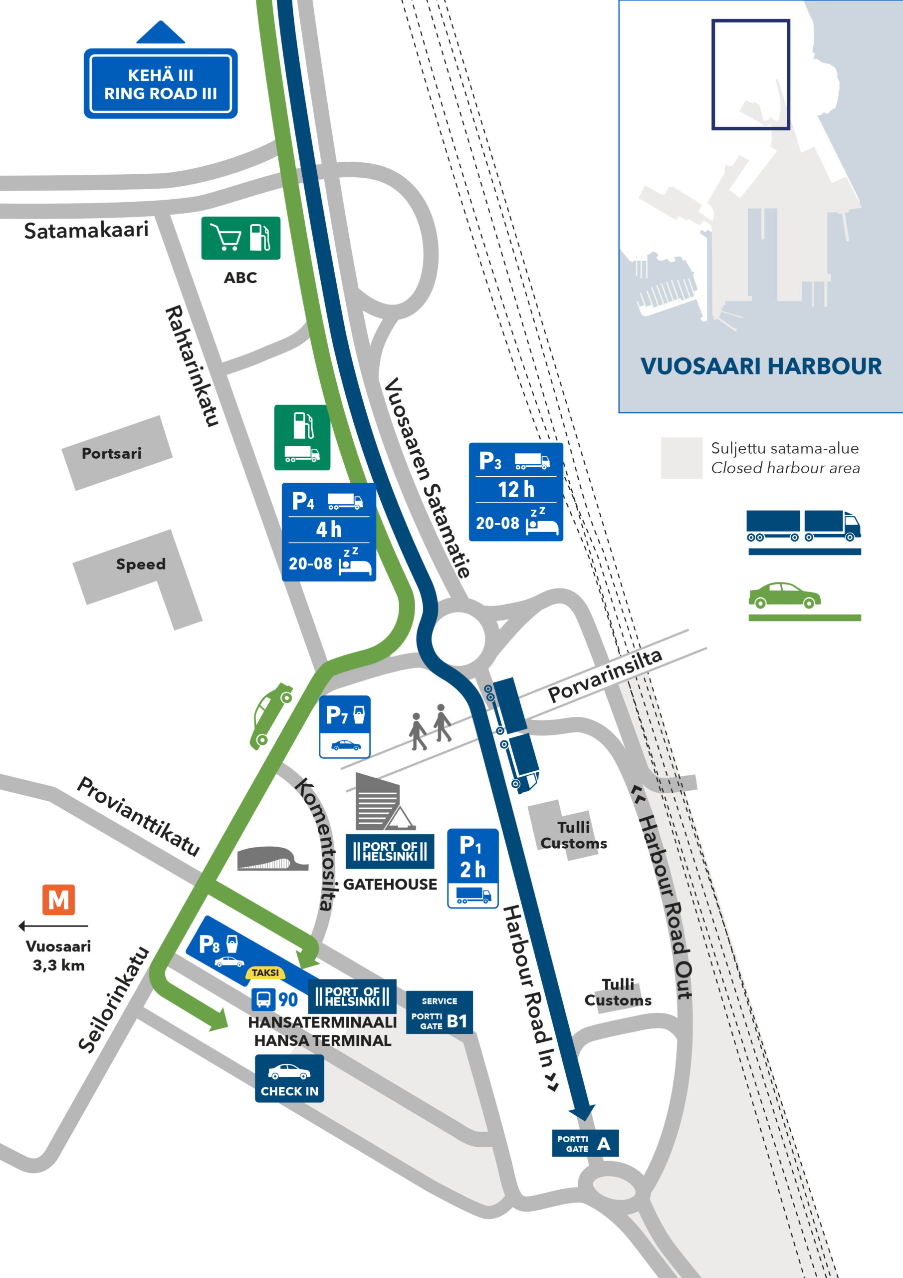 The following areas are reserved for visiting Vuosaari Harbour and as heavy vehicle traffic waiting areas: